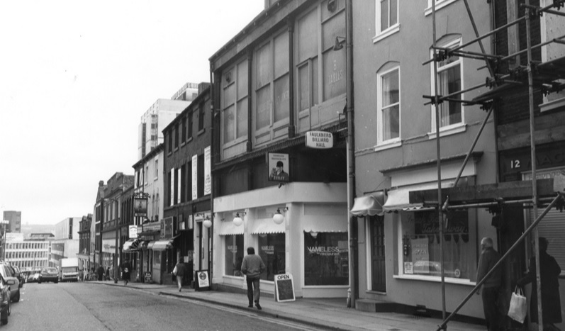 The former car showroom became the Nameless Restaurant between 1979-1985, before becoming a takeaway. In 1987, a fire in the restaurant destroyed the whole of the building, including the old billiard hall, paving the way for J.D. Wetherspoon to rebuild it, once again using the iron frame, incorporating The Benjamin Huntsman (opened 1999) with an adjacent new build.