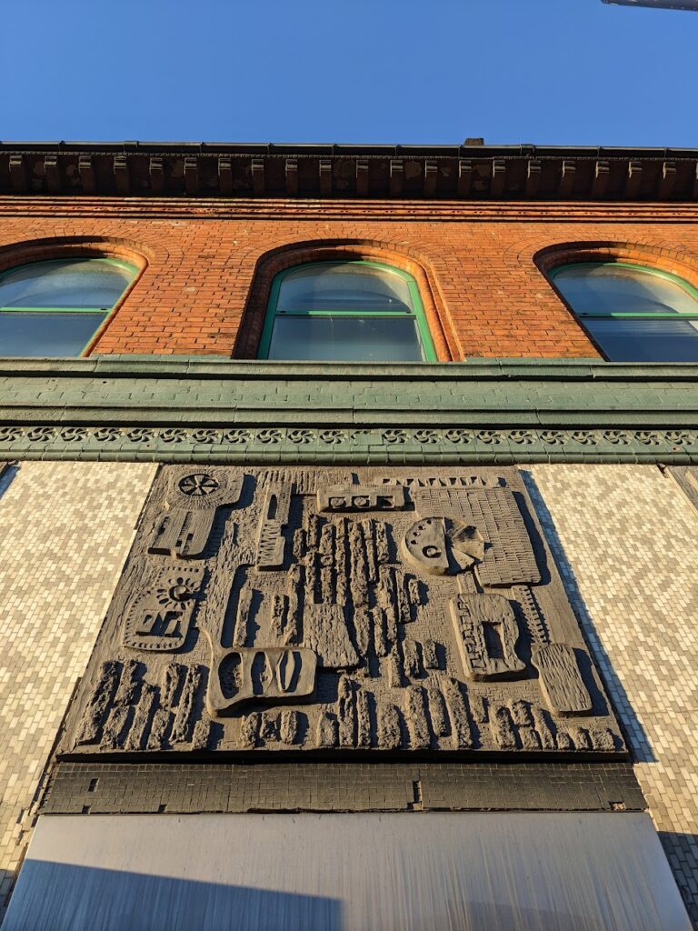 “If anything is meant to be depicted, it seems industrial. There’s a rosette feature picked up from the 19th century terracotta detail, made to look a bit like a factory extractor fan. There may be some cocoa pods – or are they crucibles? If the latter, they are matched by part of a stylised crucible furnace. That might even be a bandsaw over to the right. As for those rough-textured linear features, could they represent that most Sheffieldish of by-products, crozzle?”