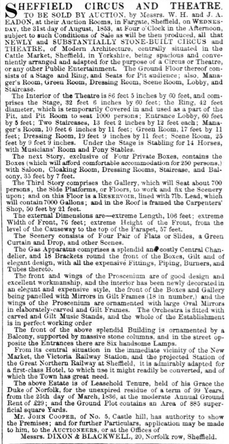 The first record we have of a circus near the New Cattle Market at the confluence of the River Sheaf and River Don was in 1836 when John Brown laid the first stone. The building was designed by the architect James Harrison, Norfolk Row, and opened as the Royal Circus with ‘Tourniare’s Splendid Equestrian Establishment consisting of forty-two horses belonging to French, German, and Italian Equestrians.’