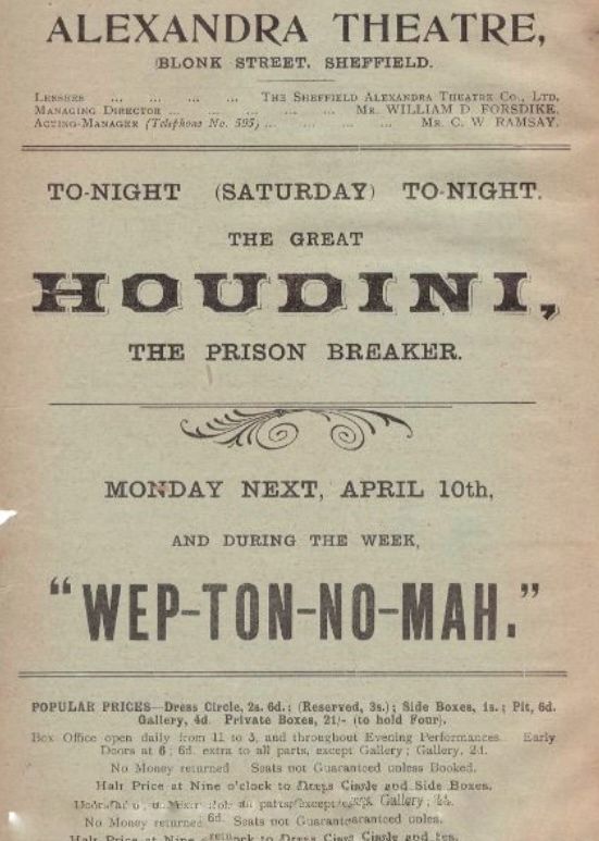 Advertisement for the Great Houdini, The Prison Breaker, Alexandra Theatre, Blonk Street. Image: Picture Sheffield