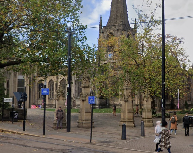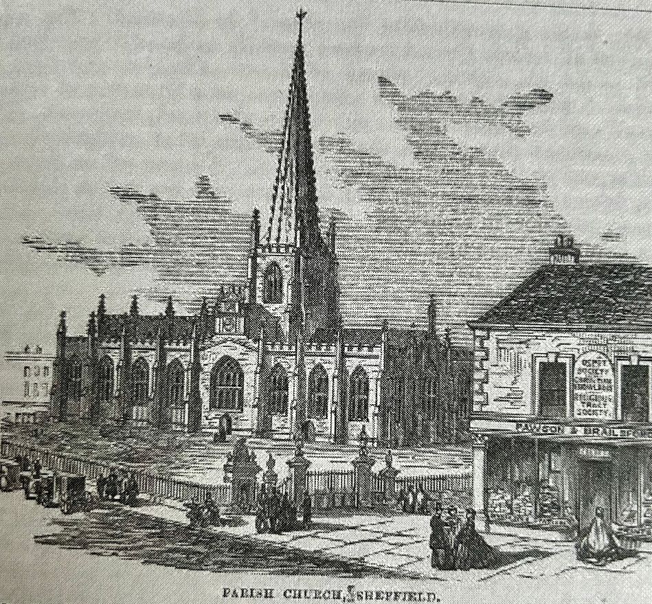 The original church gates still stand at the corner of Sheffield Cathedral’s forecourt next to East Parade. Rebecca’s Fountain would have been to the left of them. In those days, a horse-drawn hansom cab rank would have been nearby.