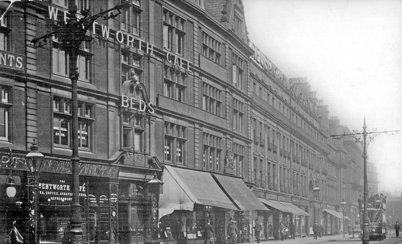 While the temperance rooms at the Citadel are decisively linked with the Salvation Army, the Citadel Building (as it became known) was better known for its commercial activities. Soon after it opened it was occupied by the Wentworth Café and Hotel, moving here from Holly Street, a socialist meeting place famously linked with Edward Carpenter. That association ended in 1922 when the whole of the premises was leased by Stewart and Stewart, the well-known tailors, who extended from next door.