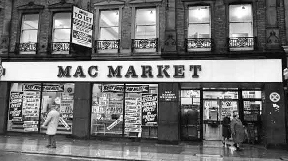 In the 1970s, Mac Market occupied three of the old shop units on Pinstone Street. The original carriage entrance passed underneath the offices above and was located where the central window is here. It remained a supermarket until fairly recently. (Picture Sheffield)