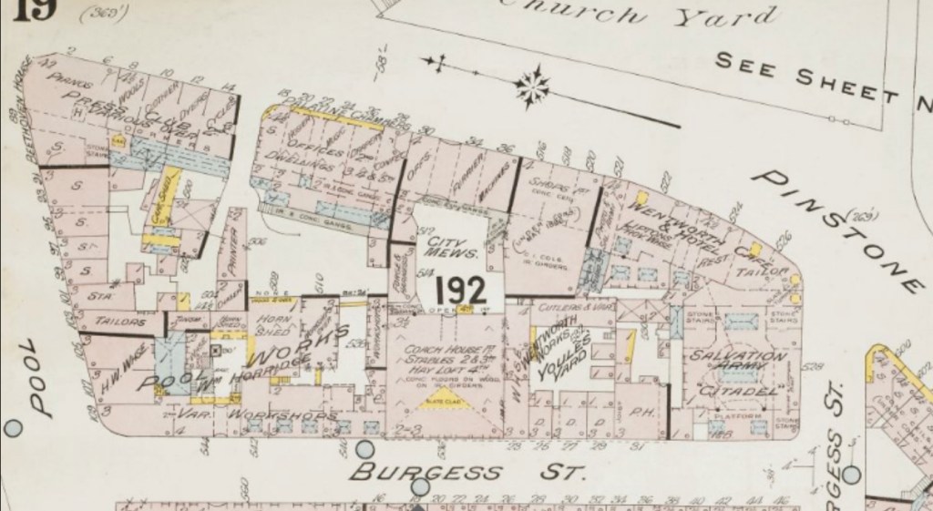 An old building plan shows Reuben Thompson’s City Mews, with stabling and carriage sheds located at the back of the Pinstone Street premises and stretching through to Burgess Street. This would later become the site of Barker’s Pool House, soon to be demolished. (Goad Insurance Plan 1896/British Library))