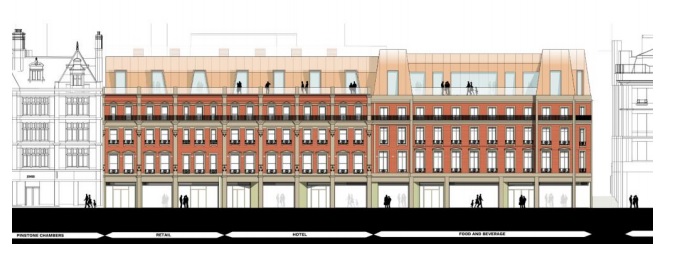 Proposed principal east elevation (Pinstone Street) for the Radisson Blu Hotel. Fifteen bays once formed Reuben Thompson’s City Mews. Palatine Chambers occupies twelve bays to the right. (Montagu-Evans)