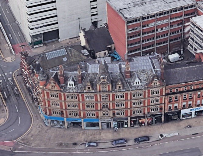 The Salvation Army had already started building its Citadel on Cross Burgess Street as well as three large business premises at its corner with Pinstone Street. Thompson bought the land alongside this, and employed Flockton, Gibbs, and Flockton to design a red brick building, with handsome stone dressings, comprising ground floor shops, and offices and flats above.