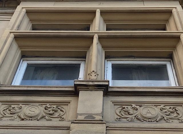 The carved initials of the Salvation Army above the main entrance. Photograph: DJP/2021