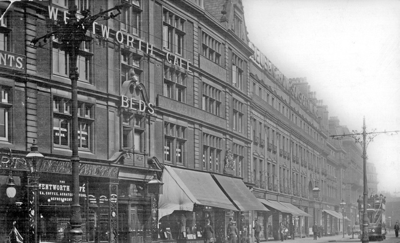 In 1895, he purchased an additional plot of land to build three additional shops. This extended the length of the original building and incorporated an entrance tunnel from Pinstone Street through to stabling and carriage sheds behind, the carriages lifted from floor to floor by a hoist.