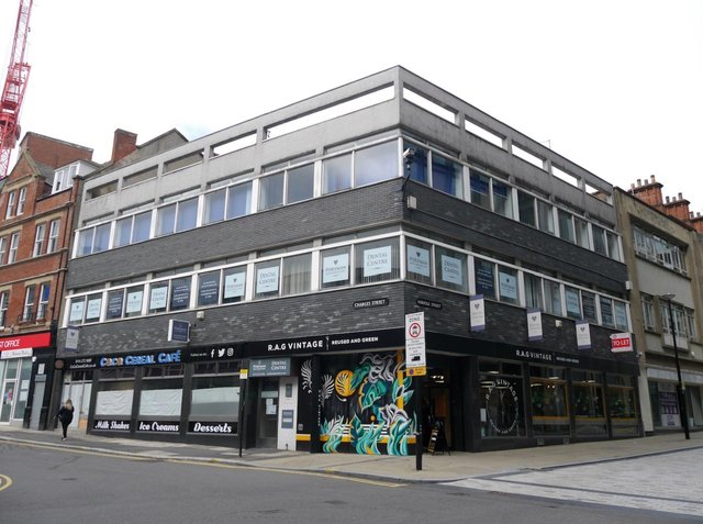 One of the buildings that will be demolished at the corner of Charles Street and Norfolk Street. Photograph: Sheffield Star.