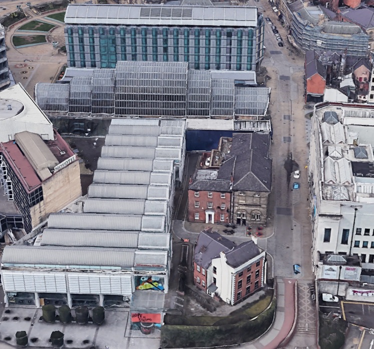 Cadman Lane ran from Eyre Street (this part of Eyre Street is now Arundel Gate) up to Norfolk Street, opposite where the Town Hall is. Only a small portion of the street remains in the centre of the picture. Photograph: Google Earth