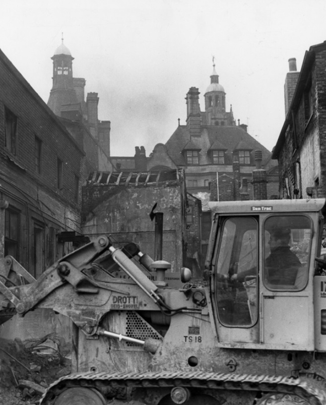 Demolition on Cadman Lane in 1966 with the Town Hall in the background. Photograph: Picture Sheffield