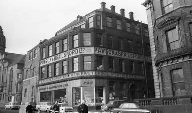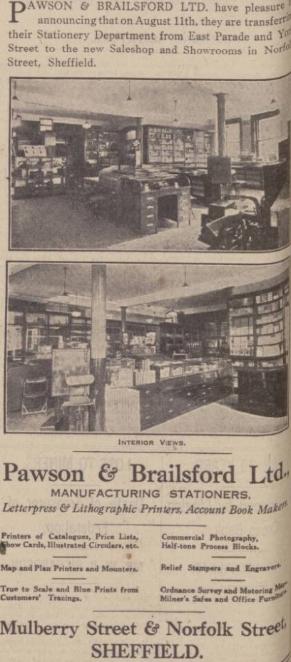 Rebuilt on each occasion, Pawson and Brailsford refurbished the building in 1930, transferring the stationary department from its High Street premises and creating “a new and commodious showroom and sales shop.”