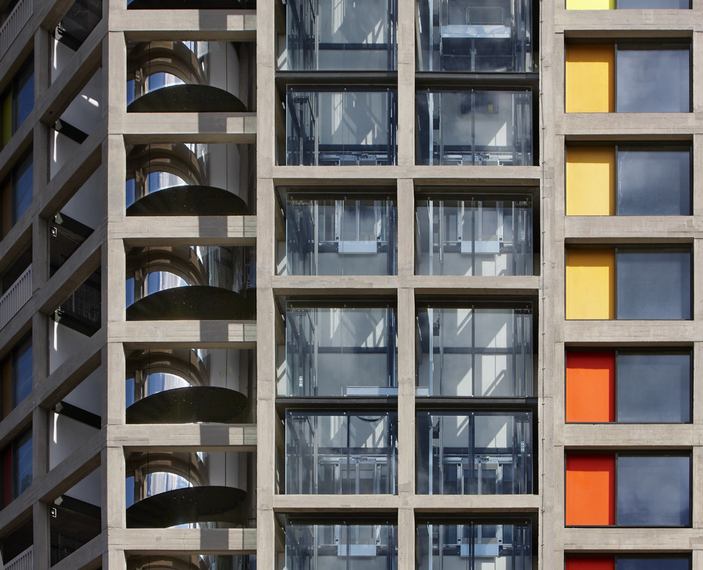 The layout was designed with fragmentary polygons, linked by bridges of 135 and 112 degrees, to enable the 10ft wide access decks on every third floor to shift from side to side so each got the sun. The blocks were arranged to create courts within which a primary and nursery school were eventually built, together with playgrounds. These were originally furnished with furniture by abstract sculptor, John Forrester, who also advised on the modelling and colouring of the facades on the blocks, street lighting and footpaths.