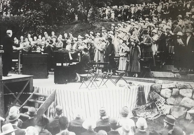 “The beautiful natural amphitheatre became a vast arena of song when the first municipal open-air community singing concert was held. The basin, with its grassy slopes and fringe of trees, is admirably suited for events of this kind. The singing was led by the Sheffield Orpheus Male Voice Choir, conducted by Mr T. Ratcliffe, and although the audience was a little shy at first, they soon joined in the choruses lustily, and sang with real heartiness songs like Love’s Old Sweet Song, On Ilkla Moor Baht At and Pack Up Your Troubles. Four hundred chairs were occupied, and a good crowd behind the ropes.”