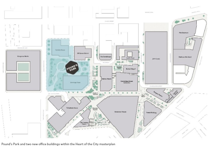 The Heart of the City II programme moves forward, and this artist impression shows Pound’s Park, a new public space that will be created on the site of the demolished Wellington Street fire station.