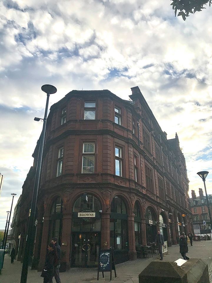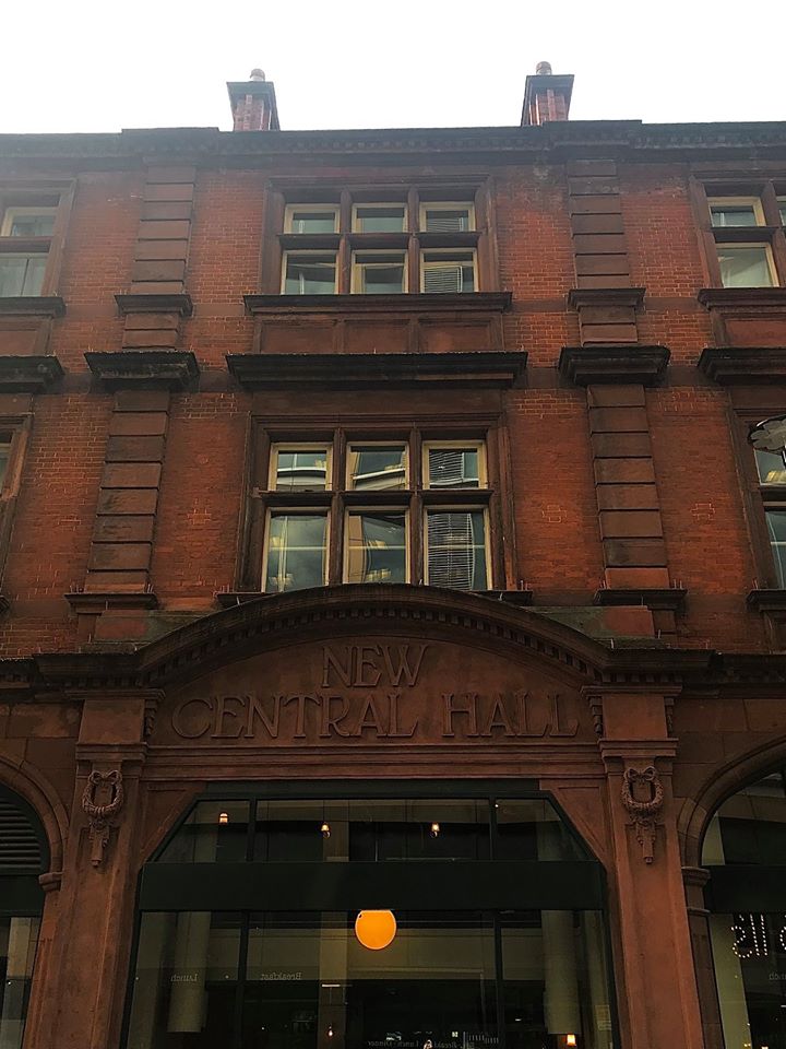 Head down to Norfolk Street, and look at part of Brown’s Brasserie and Bar. Above one of the plate glass windows is the name New Central Hall, the remains of a former decorative arched entrance.