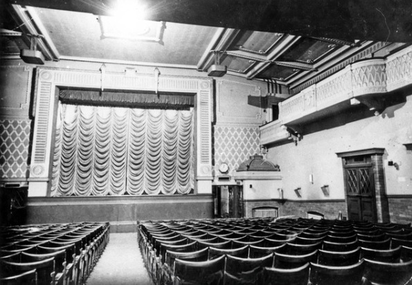 “The cinema was in reverse, and patrons entered the auditorium from behind the screen. The decoration includes pilasters, a segment-arched panelled ceiling and a moulded proscenium arch with a central crest which is flanked by torches. The circle has a lattice-work plaster front.”