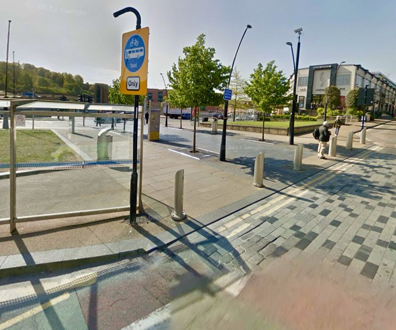 There is a large pelican crossing that crosses Sheaf Street from Sheffield Station to the bottom of Howard Street. It reaches a paved area before pedestrians must cross a narrow stretch of lower Pond Street before proceeding up Howard Street towards the city centre. This paved area is where the Midland Station Hotel once stood.