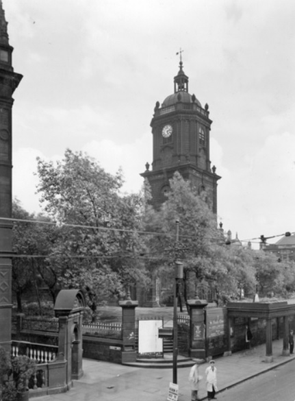 View of St. Paul’s Church from Pinstone Street showing the gateway to the Public Lavatories, Cheney Row and entrance to St. Paul’s Graveyard. Image: Picture Sheffield
