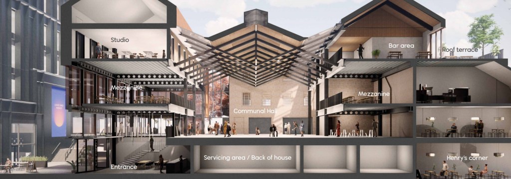 Proposals for H3, the Cambridge Street Collective include a large, stripped-back, industrial-style space, which would be ideally suited for a food hall or a similar sociable, communal offer. This space would incorporate the historic character of the Bethel Sunday School, the former Brewhouse and Henry’s venues and the building currently occupied by DINA. It would also include a more modern structure sitting behind this to enclose a gathering space, using sympathetic materials to the existing buildings.