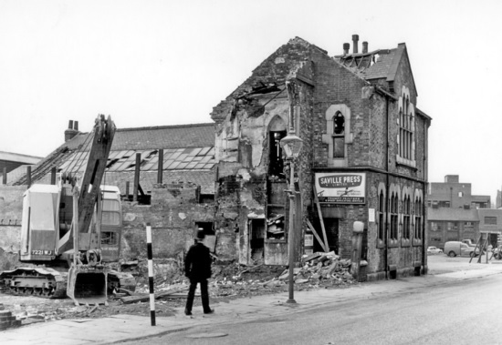 Rockingham Street, demolition of Saville Press Ltd., No 37, Wellington Street (former Mount Tabor Chapel, United Methodist Free Church). Image: Picture Sheffield